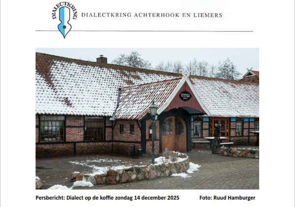 Op zondag 14 december 2025 organisaert Dialectkring Achterhook en Liemers weer een koffiemorgen bi-j Erve Kots in Lievelde. Te gast bunt; veurmalig geestelek verzorgster en parochiemedewarkster Marian Storteler-Wopereis en veurmalig pastoraal warker, leraar laevensbeschouwing-maatschappijleer Henk klein Gebbink. D’n gemeudeleken morgen steet ‘t in ’t teken van december-kasmissen, zo wodt d’r dizzen morgen meerdere kasverhalen verteld als ok ovver de geschiedenis van ’t kasverhaal en ’t onstaon van twee evangelieverhalen. Kom ok luustern naor de mooie verhalen dee de gastspraekers metbrengt.